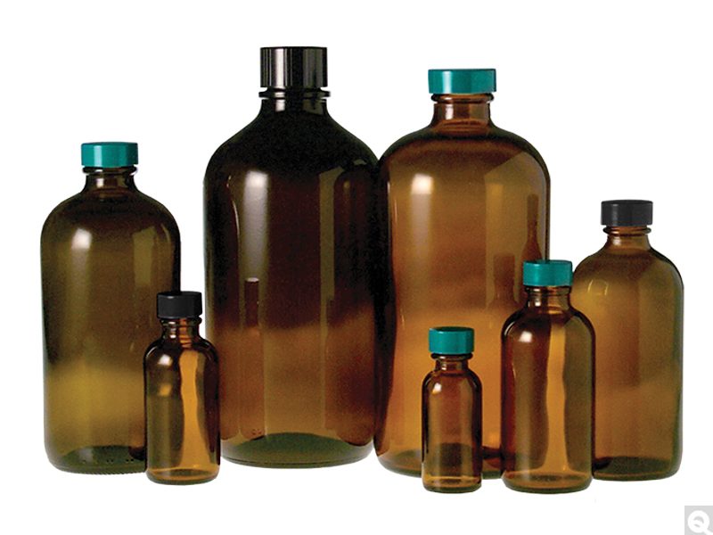 2oz Amber Boston Round with attached 20-400 Green Thermoset F217 PTFE Lined Cap, Vacuum & Ionized, cs/24