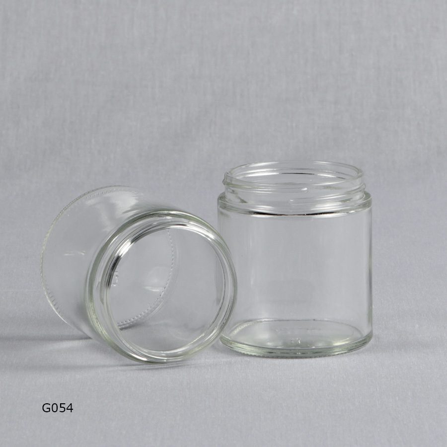 Two clear glass jars with silver lids, one upright and one lying on its side.