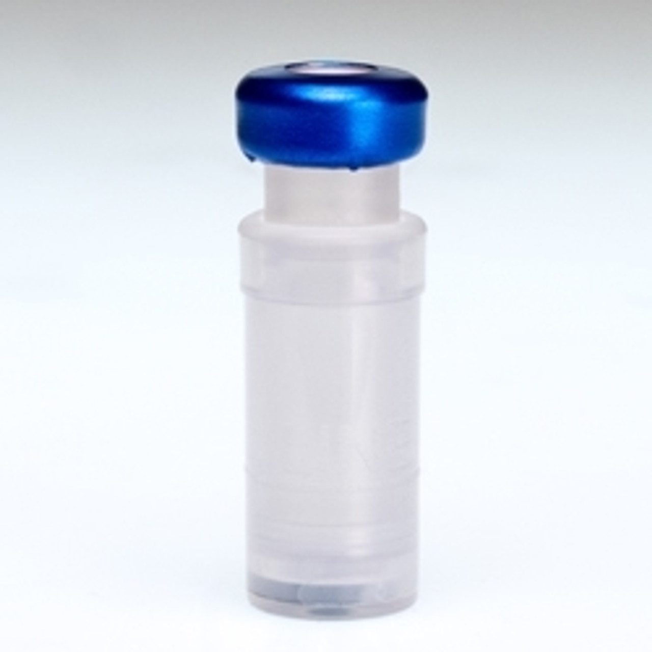 A small transparent vial with a blue cap on a white background.