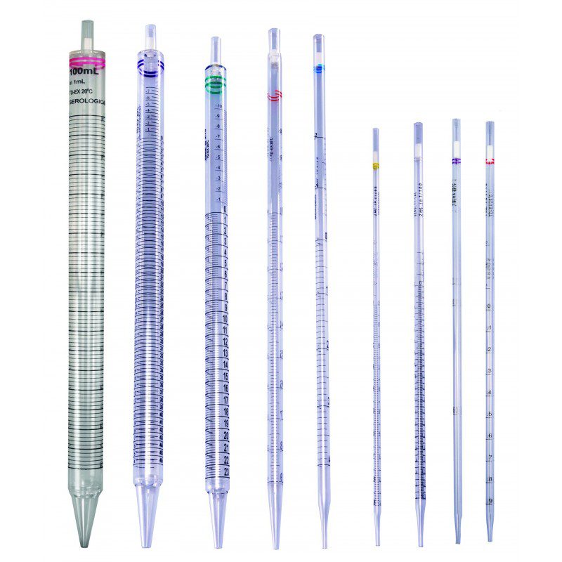Set of various sizes of glass pipettes with colored tops.