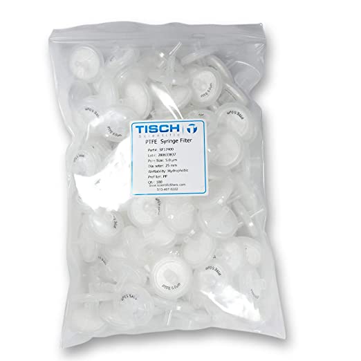Tisch Scientific PTFE Syringe Filters, 5 um, 25mm, Luer-Lok/Luer Slip, Nonsterile, 100 per pack